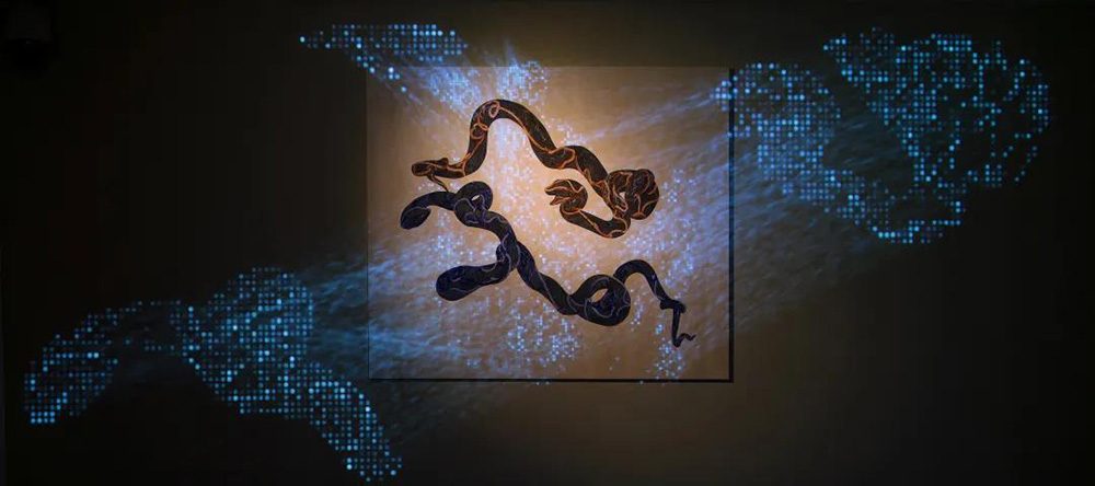 这件作品选择希腊晚期的一座雕像群《拉奥孔》为创作粉本,想表达单纯的静穆。所以把戏剧化的人物部分从绘画作品中抽离出来,只在画面部分保留了缠绕拉奥孔的蛇,这是一种对自然不可抗的无奈,体现了生命意志。周围游离的光影,就像世间万物分分合合。绘画部分的蛇本来就是象征性的,是符号的。在蛇形中穿插着如植物根茎,如山川河流,如血液经脉,在万物中传导着信息和能量。